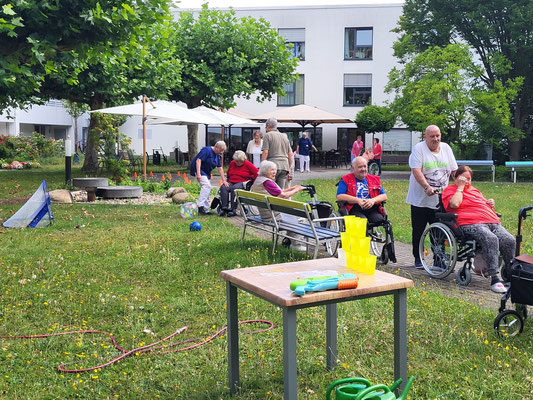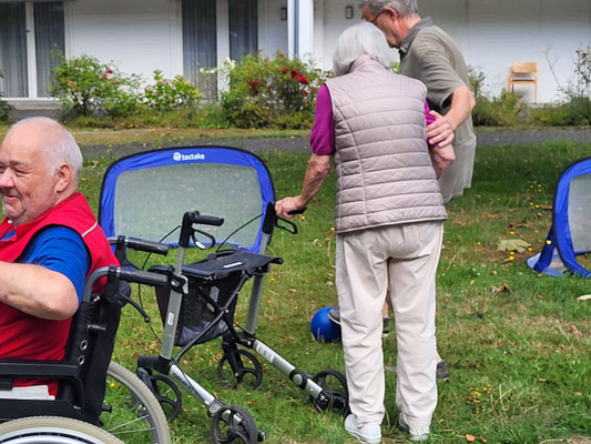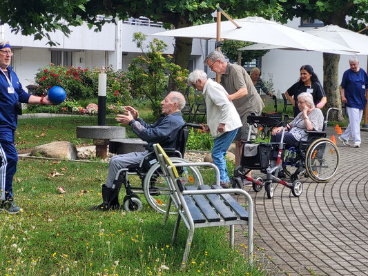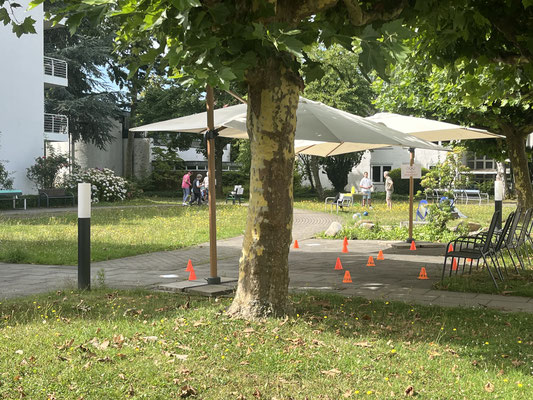 Am Mittwoch, den 23.07.25 fand bei uns im Park der Tag des Sportes statt. An verschiedenen Stationen, wie Parkour Lauf, Weitwurf, Tore schießen, Ringe werfen und Wasserpistolenweitschuss konnten die Bewohner am Morgen ihre körperlichen Fähigkeiten unter Beweis stellen. Zur Stärkung gab es Obstspieße und frische Säfte. Am Nachmittag gab es noch ein paar Aufführungen und Spiele von den Betreuungsassistenten.